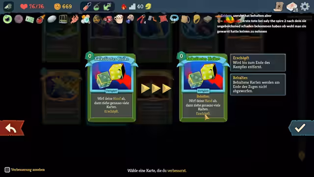 01:37:38Der Streamer entscheidet sich, den Relikt-Effekt 'Schick' zu nutzen, der alle Kartenbelohnungen verzaubert. Er wählt die Option 'Verzaubere alle Kartenbelohnungen mit Schick', was eine sofortige Kartenbelohnung zur Folge hat. Er spielt 'Wirkens Statement', was ihm maximalen TP-Kosten verursacht. Ein Gegner greift an und verursacht erheblichen Schaden, wobei der Streamer nur knapp mit 2 TP überlebt und das als sehr heftig empfindet. Er sieht sich mit zu vielen Karten in der Hand konfrontiert.