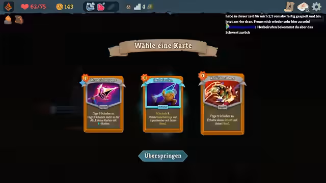 04:37:19Der Streamer kämpft gegen einen exotischen Elite-Gegner, der seine Karten manipulieren kann. Er spürt den Mangel an Energie ('Sternen') in seinem Deck, was ihm Schwierigkeiten bereitet. Um zu überleben, entscheidet er sich, eine Karte zu verbessern, um mehr Energie generieren zu können. Nach dem Kampf wählt er das Relikt 'Weißer Bastelkleber', das es ihm ermöglicht, im Kampf eigene Karten zu erschaffen. Er blickt kritisch auf die Karten-UI und die Herausforderung, die vielen neuen Karten und Effekte zu verstehen.