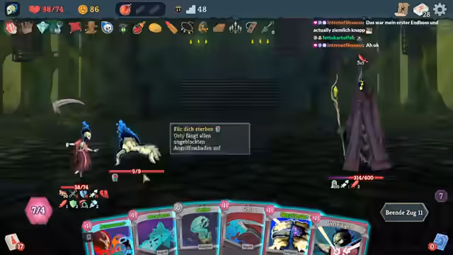 07:19:38Ein Kampf gegen einen Elite-Gegner gestaltet sich als äußerst knappe und nervenaufreibende Angelegenheit. Der Streamer muss sein Deck strategisch einsetzen, um den Charakter Osti am Leben zu halten und den Gegner mit Verderben-Schaden zu besiegen. Nach dem knappen Sieg analysiert er den Run, reflektiert über seine Spielweise und stellt fest, dass er 3 von 4 Runs gewonnen hat.