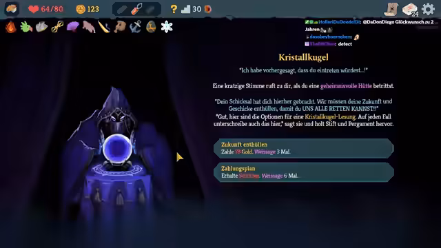01:24:29Während des Laufs wird ein zufälliges Event mit einer 'Kristallkugel' ausgelöst. Der Streamer hat die Wahl, seine Zukunft zu enthüllen und erhält daraufhin eine kleine Belohnung, aber auch einen negativen Effekt in Form von 'Schulden'. Nach diesem Event wird ein weiterer Kampf gegen einen Elitgegner, einen 'Laus-Stammvater', bestritten, der hohe Block-Werte und einen Debuff auf den Spieler legt. Der Streamer entscheidet sich, ein weiteres Mal im Rast-Event zu verweilen, um Karten zu verbessern.