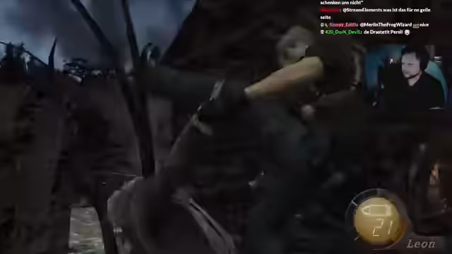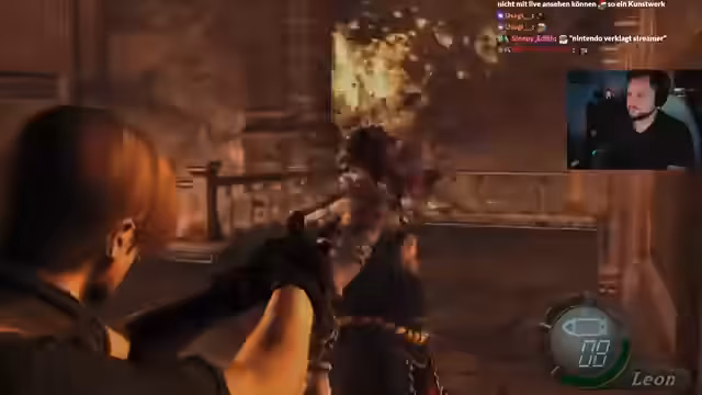 04:00:01Nachdem ein Boss mit Raketenwerfer und Schrotflinte besiegt wurde, sammelt der Streamer Belohnungen und diskutiert Strategien für Doppel-Bosse. Er notiert Hintergrundgeschichten über die Entdeckung der Las Plagas und ihre Auswirkungen auf Dorfbewohner. Im Shop kauft er Munition und diskutiert erneut Waffenwahl (Striker vs. Schrotflinte). Abschließend kämpft er gegen fliegende Gegner, nutzt Umweltmechaniken wie Laser und Betonglocken, während er technische Probleme wie Controller-Drift erwähnt und über Spielentwicklungswitze (z.B. Devil May Cry-Entstehung) lacht.
