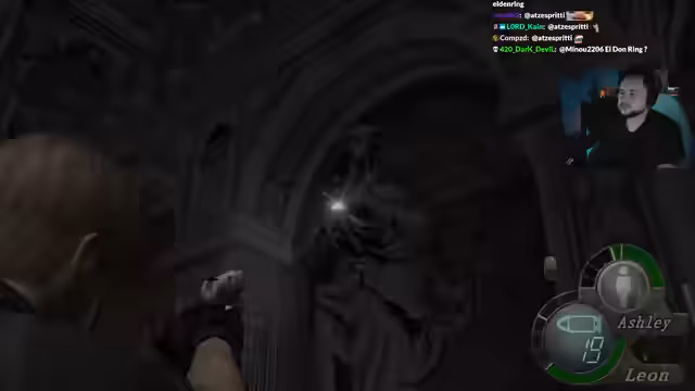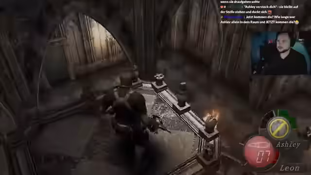 00:27:16Der Streamer muss Ashley vor Angriffen schützen; ihr Tod bedeutet Game Over. Sie zeigt Verständnisprobleme mit Umgebungsdialogen. In der Burg findet ein Rätsel statt: Ashley muss eine Kurbel bedienen, während Leon Feinde abwehrt. Es folgt ein intensiver Kampf gegen Armbrustschützen und parasiteninfizierte Feinde. Der Streamer erwirbt Schätze wie ein goldenes Ei und nutzt Medaillen für Upgrades.