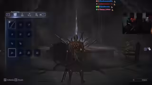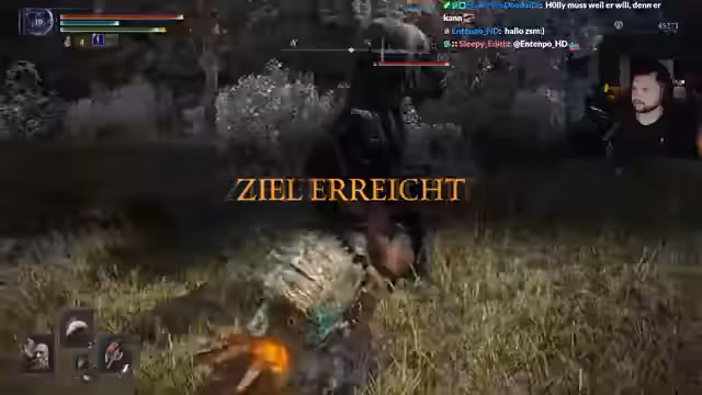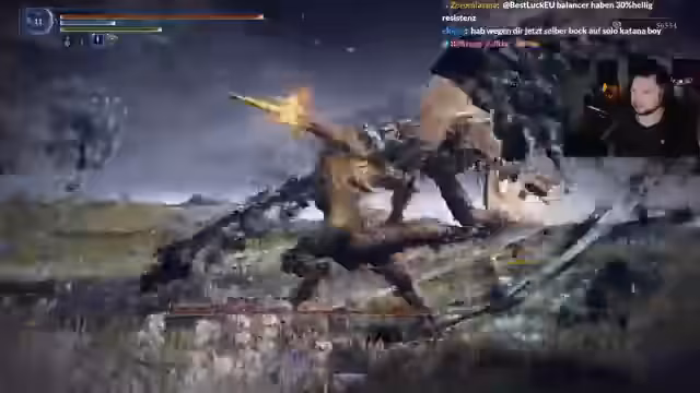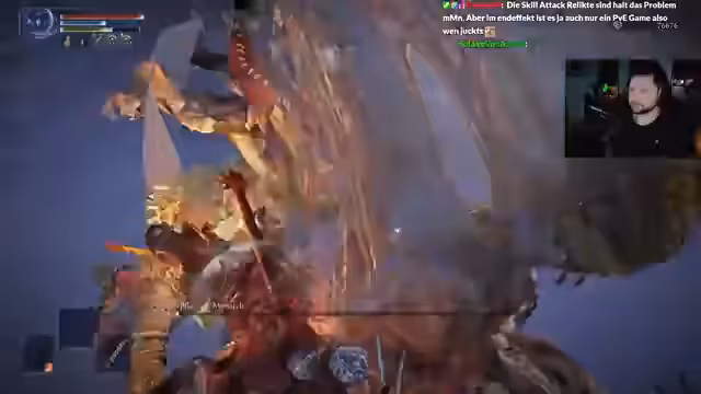 02:01:48Die Streamerin spielt Elden Ring und berichtet über ihre Charakterquests. Sie führt eine Attacke des Balancers Relict durch, wobei sie betont, wie grusig und inszeniert dieser Boss ist. Sie bewundert den Soundtrack und nennt den Boss einen ihrer Favoriten. Sie stellt Fragen zu Gegenständen, die nur bei niedrigen LP heilen, und vergleicht das aktuelle Spielverhalten mit einem früheren, sehr glücklichen Run.