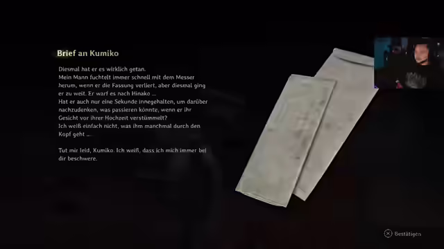 02:48:28Ein Brief von Sakuko an Chinako wird gefunden, der vor dem Spiel "Das Opfer des Fuchses" warnt. Es wird festgestellt, dass die Namen auf einem Origami durchgestrichen sind, außer Kotoyuki. Es wird spekuliert, ob die Charaktere bereits tot sind. Kotoyuki wird als der Junge identifiziert, der auf dem Spielplatz gebissen wurde und nun der Fuchsjunge ist. Es wird die Coolness hervorgehoben, dass man diese Details verpassen kann, wenn man New Game Plus nicht spielt. Der große Boss wurde entfernt, damit man sich in Ruhe umsehen kann. Es wird vermutet, dass die Kinder alle tot sind und durch einen Kult geopfert wurden. Der Spieler findet die Schlüssel für die obere Etage und speichert das Spiel. Es wird überlegt, ob der Fluch auf der Stadt durch einen verunreinigten Fluss verursacht wurde. Ein ungeöffneter Umschlag wird gefunden, in dem Chinako angelogen wird, um mit ihr allein zu sein.