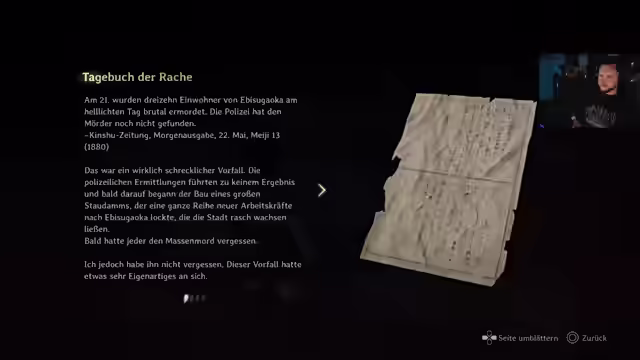 05:05:08Es wird überlegt, ob jetzt der Baum kommt, wo man das Schwert bekommt. Die besiegten Soldaten brauchten einen Ort, an dem sie sich verstecken konnten, um der Verfolgung durch die feindliche Armee zu entgehen. Sie konnten mit niemandem aus den umliegenden Siedlungen in Kontakt treten und hatten daher keine Möglichkeit, neue Waren zu kaufen. Dies zwang sie mit dem auszukommen, was sie bereits hatten und führte zu einer Kultur, in der Werkzeuge so lange wie möglich verwendet wurden. Der respektvolle Umgang mit alten Werkzeugen und die Wiederverwendung kaputter oder nicht mehr benötigter Werkzeuge galt als Tugend und wurde Kishu genannt. Man glaubte, dass sowohl das Werkzeug als auch der Gott, dem es geopfert wurde, erfreut wären, wenn ein Werkzeug das Ende seiner Lebensdauer erreicht und zur Ruhe gelegt wird. Eindeutig eine Tradition, die aus der Not heraus in einem versteckten Dorf besiegter Soldaten geboren wurde. Die Besucher sind nach dem Feuer ausgeblieben, okay. Feuer, Chad! Hier ist sie vielleicht verbrannt. Das ist doch ein Schrein. Hier ist Riko verbrannt, würde ich sagen, oder? Ihre Familie ist doch so... Die hängt doch in Schreinen ab. Die chillt doch auf so Schreins. Es werden drei Schäle gefunden, was auf drei Opfergaben hindeutet. Ein Gebäude, das überwuchert ist mit diesen Blumen. Das suchen wir. Und ich denke, da kommen wir noch hin. Bingo. Dieser See ist auch so merkwürdig. Das ist unglaublich. Ich habe das Gefühl, hier wird man vom Ufo entführt. Für das Ufo-Ending. So, kaputte Hibachi Kohlenpfanne. Dieser Kohleofen wurde mit Kohlen gefüllt, um sich zu wärmen. Zumindest bis er durch den großen Riss zerstört wurde. Und dann brach das Feuer aus. Okay, dann haben wir es gefunden. Gehen gleich nochmal kurz zurück.
