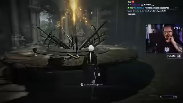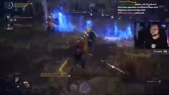 01:54:34Das Stream-Event beginnt mit dem erfolgreichen Zusammenspielen. Streamer und Co-Streamer kommunizieren über ihre Positionen und koordinieren ihre Aktionen. Sie erkunden die Spielwelt, sammeln Punkte durch das Besiegen von Bossen und achten auf besondere Gegenstände wie Talismane. Sie stellen fest, dass die Zusammenarbeit im Gegensatz zu Einzelspieler-Runden deutlich mehr Spaß macht und strategischer ist.