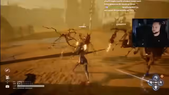 02:48:49Der Kampf gegen die Sentinels beginnt, und Schildbrecher wird als sehr starke Fähigkeit identifiziert. Die Taktik des Ausweichens und des Parryns wird erprobt. Die Mission zum Turm im Sandsturm wird fortgesetzt und der Streamer kämpft gegen Insta-Kill-Sandfässer. Der Turm wird gefunden, aber der Zugang ist blockiert. Die neue Fähigkeit "Schnelligkeit" wird als nützlich für das Springen und Ausweichen erprobt.
