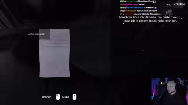 04:15:01Nach dem ersten Spiel wechselt der Streamer zu 'Klink', einem Horrorspiel im Stil von Silent Hill. Der Protagonist ist ein Patient in einer psychiatrischen Anstalt, der unter Halluzinationen leidet. Seine Aufgabe ist es, die ihm verschriebenen Pillen einzunehmen und die mysteriöse Katze seiner verstorbenen Frau zu finden. Das Spiel erzeugt eine unheimliche, klaustrophobische Atmosphäre durch verdächtige Geräusche, unerklärliche Vorfälle und eine zunehmend paranoide Stimmung des Protagonisten.