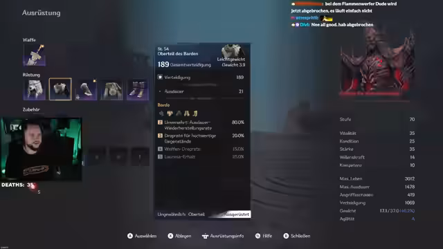 07:48:23Es wird die Herstellung von Chaos-geplagten Schulterstücken erwähnt und das Aussehen des Helms als fragwürdig eingestuft, das Cape jedoch positiv hervorgehoben. Es folgt die Verbesserung der Ausrüstung, wobei festgestellt wird, dass nur Gegenstände höherer Stufe verwendet werden können. Eine Hose wird gecraftet, und es wird versucht, weitere Ausrüstung zu verbessern. Die Attribute des Schwerts werden analysiert, und es wird überlegt, welche Stats geändert werden sollen. Es wird festgestellt, dass durch eine Fertigkeit eine Bonus-Fähigkeit freigeschaltet wird. Anschließend wird kurz das nächste Level betreten, um die Rüstung zu testen. Es werden Seelensteine aktiviert, die Boni wie Lebenswiederherstellungszunahme bringen. Die Story wird kurz angeschnitten, wobei es um die Suche nach Überbleibseln des Chaos geht. Ein neues Level wird optisch gelobt und erinnert an Berserk. Es wird versucht, die Rüstungsboni zu verstehen, insbesondere den Punkt über Geisterfertigkeiten.