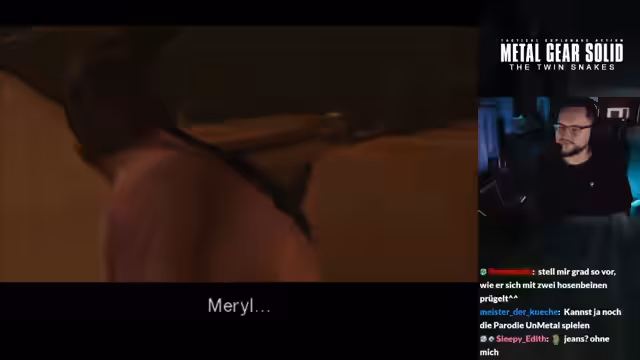 03:09:17Nach dem Kampf ist Snake erschöpft, aber der Streamer nutzt die Gelegenheit, wichtige Dialoge zu zeigen. Snake erklärt seiner Begleiterin Meryl, dass es im Krieg keine echten Helden gibt, nur tote oder inhaftierte Personen. Meryl ihrerseits gesteht ihre Motive: Sie wurde Soldat, um Snake besser zu verstehen, aber sie hatte Angst vor sich selbst. Der Streamer spielt dabei absichtlich "Pervert Snake", der Meryl auf ihre Reaktion prüft. Meryl wehrt sich gegen die Avancen und willigt ein, gemeinsam mit Snake nach Norden zu gehen, um Metal Gear Rex zu zerstören, falls die Sperre nicht rechtzeitig überbrückt werden kann.