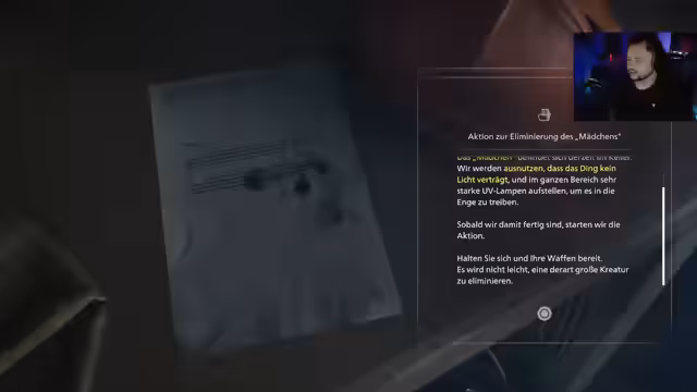 06:02:24In einer Safe Room findet die Streamerin Blutkonserven und Arzneispritzen, die sie für den weiteren Weg benötigt. Sie liest ein Dokument, das von einem Mitarbeiter geschrieben wurde, der als Letzter überlebt, aber den Verstand verliert. Sie stellt fest, dass Grace für den bevorstehenden Bosskampf noch fehlt. Die Streamerin erfährt, dass das kleine Mädchen mutiert ist und die andere, die sie begleiten sollte, möglicherweise ebenfalls mutieren wird. Die Spannung steigt, da sie in einer blutverarbeitenden Anlage steckt.