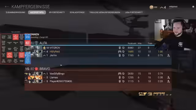 01:35:39Nach dem Erfolg mit den Browser-Games wechseln die Spieler zurück zu Combat Master, um ein Bingo-Feld für einen PvP-Sieg zu erfüllen. Nach mehreren vergeblichen Versuchen, im selben Team zu landen, entscheiden sie sich, jeweils den ersten und zweiten Platz in separaten Teams zu erreichen. Ein langer, nervöser Kampf beginnt, in dem beide Spieler versuchen, die vorderen Plätze im Scoreboard zu sichern. Am Ende gelingt es, die Bedingung als Erster und Zweiter zu erfüllen und das Feld abzuhaken.