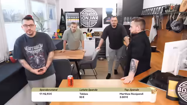 02:18:14Vasily berichtet von seiner angenehmen Anreise und dem herzlichen Empfang. Es wird das fünftägige Programm der Bon Joalane vorgestellt, das Nachmittagsprogramme bis 19 Uhr umfasst, gefolgt von besonderen Abendsegmenten wie Quizshows oder Dienstagsmaler. Ab 20 Uhr (oder 20:30 Uhr) beginnt die Abendschicht. Der rote Faden des Events ist eine Charity-Win-Challenge, bei der Bonjoa für jedes geschaffte Spiel spendet. Der aktuelle Spendenstand von über 17.000 Euro wird bekannt gegeben, was die Motivation der Teilnehmer zusätzlich steigert. Die Diskussion dreht sich auch um die Dynamik innerhalb der Gruppe und die bevorstehenden Gaming-Wettkämpfe, die dazu dienen sollen, die Hierarchie zu klären, bevor gemeinsam gespielt wird.