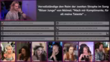 04:42:09Die Teilnehmer müssen einen Reim im Song 'Böser Junge' von Ikimel vervollständigen. Viele humorvolle und kreative Antworten werden im Chat geteilt. Nach Ende der Abstimmung wird die richtige Lösung als 'Ich bin ne Granate. Sei froh, dass ich dich Knechte' bekannt. Die zeigt Begeisterung für die kreativen Teilnehmer und betont die Schwierigkeit, mit der richtigen Antwort nicht zu nah an die falsche heranzukommen.