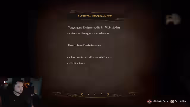 06:25:19Eine neue Funktion der Kamera Obscura, der Parasichtfilter, wird entdeckt. Dieser Filter ermöglicht es, vergessene Ereignisse und verschwindende Spuren der Vergangenheit sichtbar zu machen, indem er Schatten aufnimmt, die zu Bildern werden. Der Streamer experimentiert mit dieser Funktion, um verborgene Orte und Geister aufzuspüren, und folgt den Spuren, die zu optionalen Aufgaben und verborgenen Wegen führen.