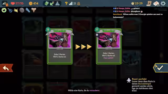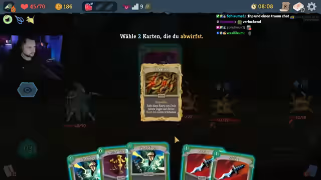 01:54:07Nachdem ein Abwurfdeck nicht zum Erfolg führte, entscheidet sich der Streamer für einen neuen Ansatz. Er findet im Shop eine schlagkräftige Kombination aus Karten wie 'Parry Schild' und 'Schnitt', die ihm hilft, Elite-Gegner effektiver zu bezwingen. Er testet verschiedene Strategien und findet mit 'Albtraum' und 'Omnischnitt' eine mächtige Combo, die ihm im weiteren Run als große Hilfe dienen könnte.
