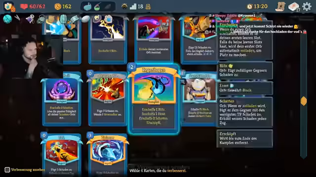 01:52:36Ein weiteres Event wirft einen Schatten auf das Deck, da es den Streamer zwingt, fünf seiner wertvollsten Karten zu entfernen. Als Ausgleich bietet das Event jedoch eine sehr starke Belohnung: nach jedem Kampf erhält er eine zufällige Verbesserung zurück. Um dies zu nutzen, entscheidet er sich für eine optimistische Strategie, die auf langfristiges Deck-Recycling setzt, während er auf das Finden von 'Kreative KI' hofft, um den nun entstehenden Orb-basierten Schaden zu maximieren.