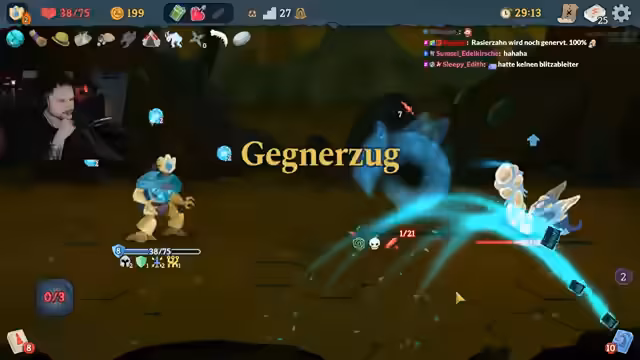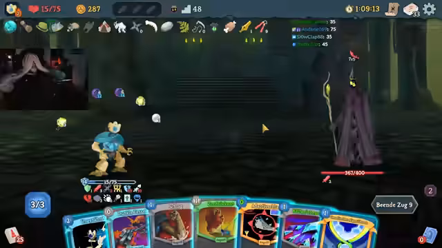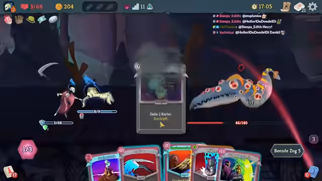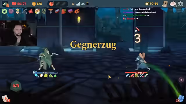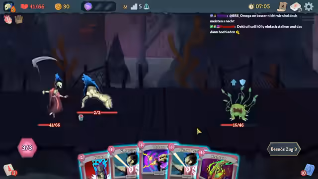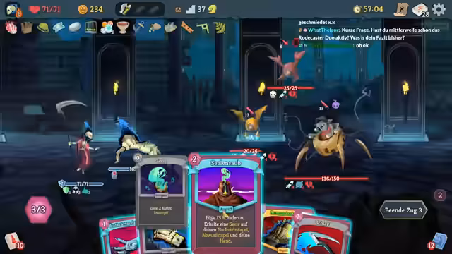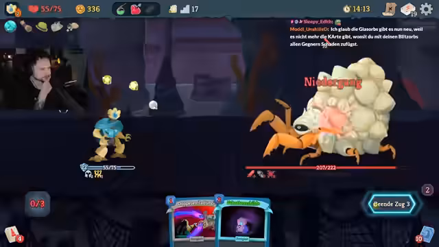 07:58:54Nach mehreren erfolgreichen Kämpfen steht der Bosskampf an. Streamer h0llylp nutzt seine aufgebauten Sterne, um in der letzten Phase den Boss mit Karten wie 'Sternenkind' und 'Gamma-Strahl' anzugreifen. Eine zentrale Rolle spielt dabei die Karte 'Qual der Wahl', deren Kosten durch andere Effekte auf null gesenkt werden, sodass sie kostenlos und sofort wieder auf den Nachziehstapel gelegt werden kann. Es besteht eine komplexe Abhängigkeit zwischen Sterne-ausspielen, Block generieren und Karten-Ziehen.