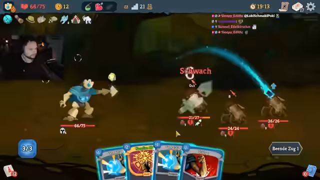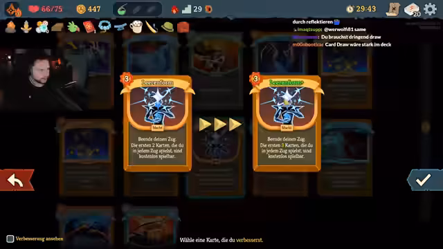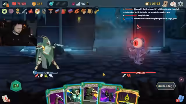 00:17:20Eine Phase der Deck-Optimierung beginnt, bei der der Streamer Karten wie 'Plätten' und 'Pieksen' kombiniert, um Schaden zu maximieren. Er entdeckt die starke Synergie zwischen 'Zurückholen' und 'Plätten', um Karten vom Abwurfstapel auf die Hand zu ziehen und wieder gratis auszuspielen. Trotz eines starken Decks gerät er bei einem Kampf gegen einen Elite-Gegner ins Wanken und erkennt, dass er die Gefahr durch dessen wachsende Stärke unterschätzt hat, was zu einem engen Überleben führt.