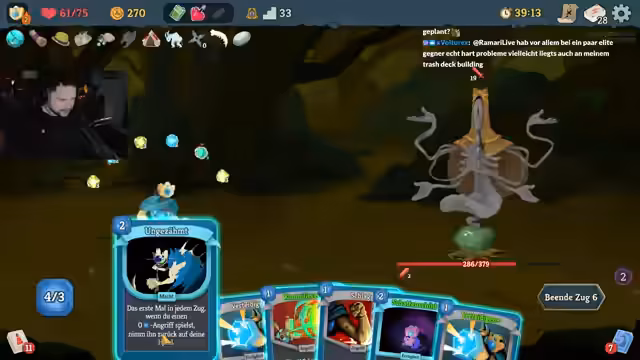 05:09:58Nachdem der Versuch, den Elite-Gegner zu besiegen, gescheitert ist, muss der Streamer rasten und seine Strategie anpassen. Er nutzt die Rastzeit, um seine Karten zu verbessern und seine Macht-Kombination zu optimieren. Er plant den nächsten Versorge, wobei der strategische Fokus auf dem Aufbau eines perfekten ersten Zuges liegt, um frühzeitig eine starke Position zu sichern und den Verlust von Lebenspunkten zu minimieren.