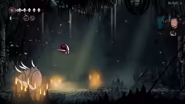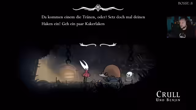 08:32:01Nachdem der Streamer die Fahrstühle des Spiels kritisiert und sie für schlechter als im ersten Teil hält, betritt er einen neuen Abschnitt namens Graumor. Er findet eine Sackgasse, in der sich ein Boss namens 'Große Muschelfliegen' befindet. Der Kampf erweist sich als lang und zäh, da er viele Treffer benötigt, und die nervige Musik bei dem Streamer PTSD-artige Reaktionen hervorruft.