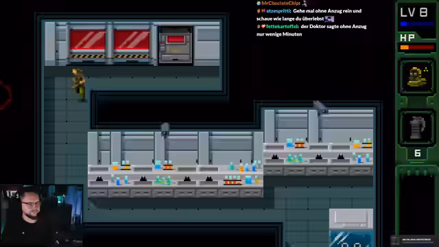 00:44:16Nach den anfänglichen Themen wechselt der Stream zur Eröffnung des Spiels 'UNMETAL'. Der Streamer begrüßt die Zuschauer auf seinem 'lieblos zugeschissenem VUD-Kanal' und beginnt direkt im Spiel. Er lobt die Musik im Spiel, hat aber Schwierigkeiten, sich an den letzten Stand zu erinnern. Er erwähnt den Pixel-Stil und die CRT-Scanlines, beschwert sich über das schlechte Sichtfeld der Gegner und sucht nach Secrets. Die ersten Schritte des Gameplays werden unternommen, um eine Wache und Secrets in der Krankenstation zu finden.