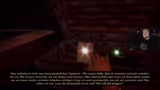 02:25:21Der Streamer findet einen Kistenschlüssel und eine Seite aus einem Buch, die eine Häresie über Gott und die Anima Mundi enthält. Er überlegt, ob er alle Homunculi abschlachten soll. Es wird diskutiert, ob JetTPT eine Anleitung zur Erschaffung eines Homunculus schreiben kann. Der Streamer findet eine Fackel als Waffe und löst ein Rätsel, indem er eine Tür öffnet. Die Wasserstraßen werden erkundet und ein Bericht über die alchemistischen Aktivitäten der Homunculi gefunden. Der Streamer findet den Schlüssel zu den Wasserstraßen und zündet damit etwas an.