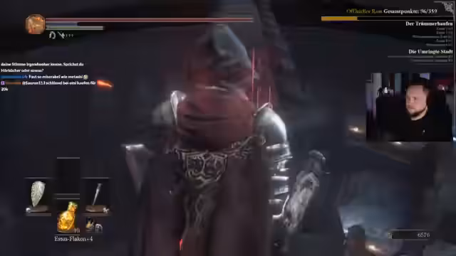 01:28:06Im Sumpfgebiet wird der Streamer vom Invader „Hazel“ angegriffen. Dies ist ein unvorhergesehener, gefährlicher Moment, da Hazel sich in verschiedene Gegenstände verwandeln kann und mit magischen Angriffen hohe Schaden verursacht. Nach einem anfänglichen Rückzug und der Nutzung aller verbleibenden Heil-Tränke wird Hazel durch konsequentes Ausweichen und Parry-Einsätze besiegt. Der Sieg beschert nicht nur drei Punkte, sondern gewährt auch drei Estus-Rücksetzer, was einen entscheidenden Vorteil für den weiteren Verlauf darstellt.