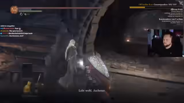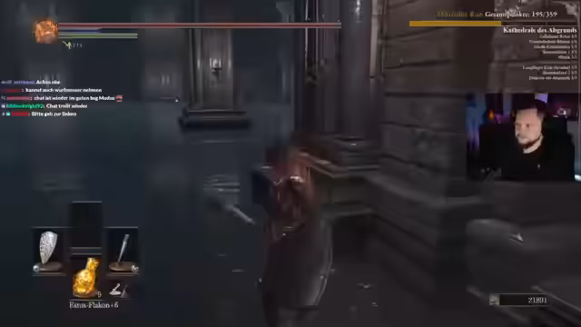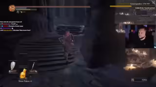 02:50:57Mit 10 Estus und verbesserter Ausrüstung geht es Richtung Kathedrale. Der Streamer wechselt die Waffe zu einem gottlosen Großschwert, um sie auf Stärke-Skalierung umzustellen. Er kämpft gegen Priester, deren Verhalten unvorhersehbar sein kann, und sammelt dabei Köderschädel. Die Katakomben werden als gefährliches Gebiet beschrieben, in dem langsame Kämpfe tödlich sein können. Der Kampf gegen den dortigen Boss erinnert ihn an Dark Souls 2 und wird als besonders knappe Erfahrung geschildert.