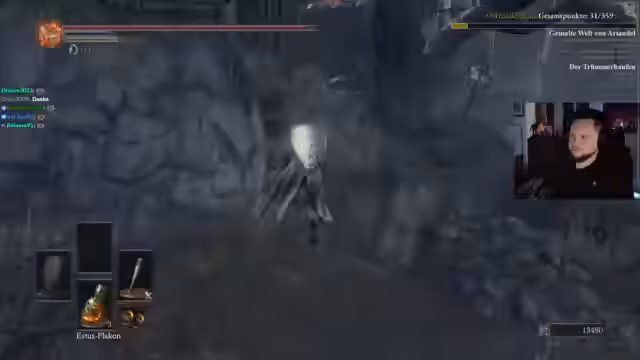 00:12:44Der Run beginnt mit dem Einloggen und der Landung im ersten Gebiet. Der Streamer sammelt direkt die Titanitscherbe und macht sich anschließend auf den Weg zu Gundir, dem ersten Boss der Route. Der Kampf verläuft holprig, es gelingt kein Parry, aber Gundir wird besiegt, was die ersten fünf Punkte bringt. Anschließend wird der Weg in die Untote Siedlung angetreten. Dort werden einige Gegner und Items wie Seelen und Brandbomben eingesammelt, um den Run voranzutreiben.