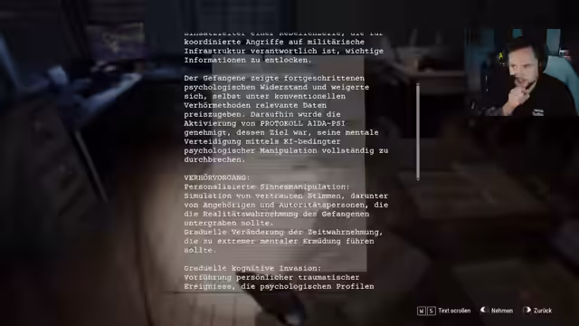 05:54:07Es wird eine vertrauliche militärische Aufzeichnung über das Projekt AIDA (Artifizielle Intelligenz für defensive Analyse) gefunden. Dieses Projekt wurde entwickelt, um strategisch wertvolle Informationen von Gefangenen zu entlocken, die konventionellen Verhörmethoden widerstanden. Die erste Implementierung von AIDA erfolgte in einem Verhörsszenario, um einen Rebellenzellenleiter zu manipulieren. Das Protokoll Ida Psi wurde genehmigt, um die mentale Verteidigung des Gefangenen mittels KI-bedingter psychologischer Manipulation zu durchbrechen. Dies umfasste personalisierte Sinnesmanipulationen, wie die Simulation vertrauter Stimmen, graduelle Veränderungen der Zeitwahrnehmung, kognitive Invasionen durch Vorführung traumatischer Ereignisse und Realitätsverzerrungen durch akustische und visuelle Halluzinationen. Nach über sechs Stunden Exposition zeigte der Gefangene eindeutige Anzeichen eines mentalen Zusammenbruchs, was zur Gewinnung wichtiger Informationen führte. Das Verhör wurde abgebrochen, nachdem unumkehrbarer kognitiver Verfall festgestellt wurde, einschließlich akuter Verfolgungswahn, extremer Angst und Depersonalisation. Die Spielenden erkennen, dass sie selbst Opfer einer ähnlichen Manipulation sein könnten und vermuten, dass sie eine falsche Version von AIDA heruntergeladen haben.