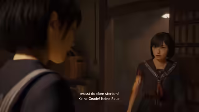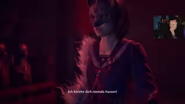 00:47:18Die Streamerin bemerkt, dass sich ein Rätsel verändert hat und dass für dieses Ending die anderen Charaktere verschwinden müssen. Sie findet den Vogelschlüssel und erinnert sich daran, wo er verwendet wird. Nach einer Cutscene äußert sie ihren Unmut darüber, dass sie nicht durchgehen kann. Sie wird aufgefordert, über ihre Wünsche nachzudenken, aber auch ihren Vater zufriedenzustellen. Die Streamerin macht eine Pinkelpause und kommentiert ihr gelbes Aussehen im Stream. Sie findet eine Puppe und fragt sich, was sie bedeutet. Ein weiteres Rätsel wird gelöst, bei dem das Schwert und der Fuchs auf einer Waage kämpfen. Es kommt zu einer Konfrontation mit dem inneren Selbst, in der die Protagonistin sich fragt, warum sie nicht sie selbst sein will. Die Streamerin findet Briefe von Kotoyuki und vermutet, dass es sich um den Fuchsmann handelt. Sie legt etwas Kleines in den Schrein und besiegt den Vater im Spiel. Die Mutter muss nicht mehr besiegt werden. Die Streamerin kommentiert die Zwangsverheiratung und den Gesichtsverlust der Protagonistin.
