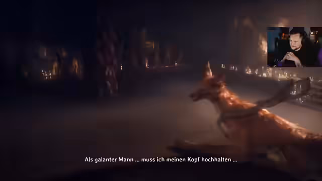 00:31:26Im Spiel wird ein Rätsel vorgelegt, das sich im New Game Plus verändert hat. Es handelt sich um eine Geschichte über einen Kampf zwischen einem Schwert und einem Fuchs auf einer Waage. Der Streamer findet heraus, dass er drei Wappen an den dafür vorgesehenen Stellen anbringen muss. Anschließend erlebt er eine Cutscene, in der er auf seinen Doppelgänger trifft, der seine innersten Gedanken und Wünsche anspricht und ihn dazu drängt, das Angebot des Fuchsgeistes anzunehmen und sein altes Ich zu töten.