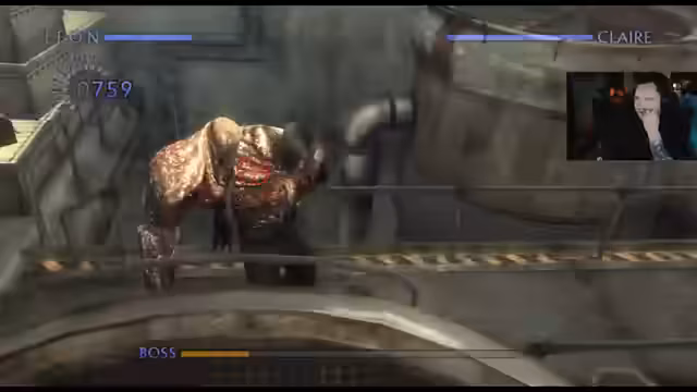 01:34:15Das Gameplay wird von mehreren schwierigen Bosskämpfen dominiert. Gegen den G-Virus infizierten William Birkin (G-Adult) muss der Streamer eine spezielle Mechanik anwenden, indem er ein bestimmtes Ziel anvisiert, um ihn zu schwächen. Nach mehreren Anläufen gelingt es ihm, den Boss zu besiegen. Anschließend folgt die Flucht aus dem Labor mit Ada Wong, bevor sie 'stirbt', was der Streamer kommentiert.
