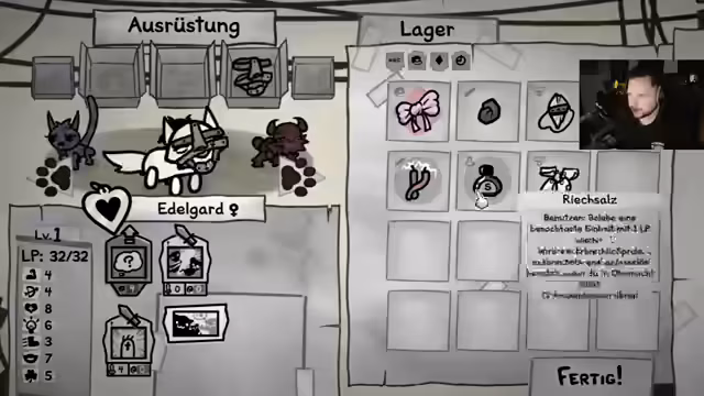 04:27:05Nachdem die Kanalisation erfolgreich überstanden wurde, erwartet das Team eine Belohnung. Es gibt eine Auswahl neuer Gegenstände, darunter ein 'Energydrink' und 'Gras', und der Platz im Lager wird aufgestockt. Zudem wird ein neues Halsband für eine Katze namens 'Dieb' freigeschaltet, der als persönlicher Favorit gilt. Der Streamer wählt, welche Gegenstände er behält und entscheidet sich, in die Höhlen aufzubrechen, um das Abenteuer fortzusetzen.