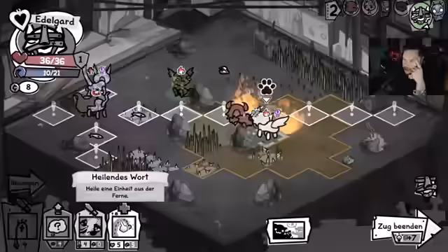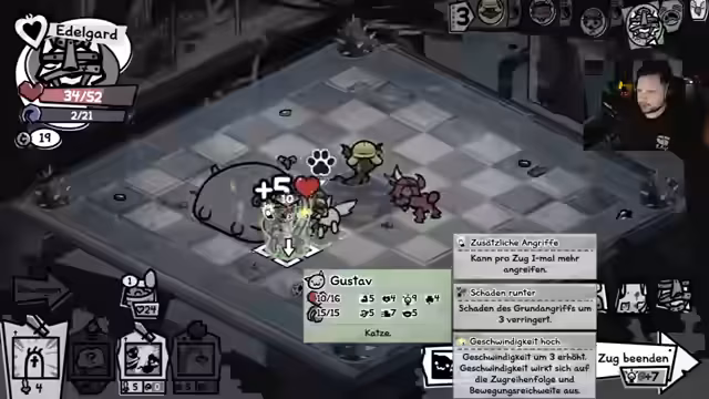 01:18:00Im Mittelpunkt des Gameplays stehen verschiedene Fähigkeiten und Items, die das Kampfgeschehen beeinflussen. Streamer erkundet die Mechaniken, darunter Immunisierung gegen Rückstoßfelder, die Umwandlung in Schmutz, und das Verschieben von Einheiten. Wichtig sind auch der 'vibrierende Meteorit', der dauerhaft Attribute verliert, aber nicht mehr abgelegt werden kann, sowie Stammzellen für Lebensenergie-Regeneration. Es wird aktiv über die Ausstattung der Katzen debattiert, Jacqueline erhält einen Stärke-Boost, und ein 'Sonderbonbon' für sofortiges Leveln wird in Betracht gezogen.