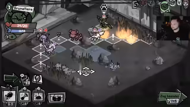 01:43:34Die Kämpfe werden als anspruchsvoll beschrieben, mit taktischen Elementen wie dem 'hohen Gras' für Verdeckung und Status-Effekten wie 'eingefroren' oder 'verlangsamt'. Items wie 'Geode' oder 'Stein des Sanftmuts' werden strategisch eingesetzt. Die Unsicherheit über die Funktionsweise einiger Fähigkeiten, wie 'zerstöre eine Leiche', und der Wechsel der Rollen im Team (Tank, Heiler, Jäger) sind zentrale Themen. Das Team kämpft gegen eine 'Radikale Ratte', deren Bomben bei Regen inaktiv sind, und versucht, diese zu entschärfen, was zu chaotischen aber erfolgreichen Aktionen führt.