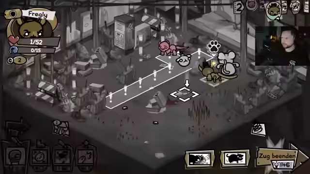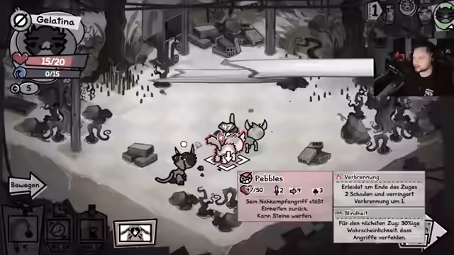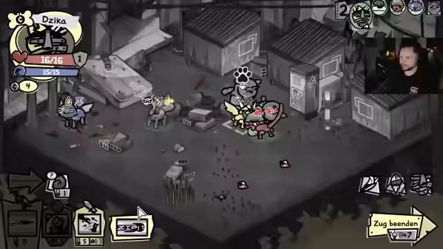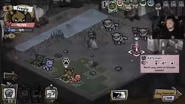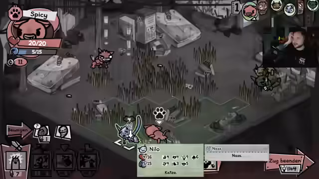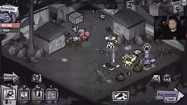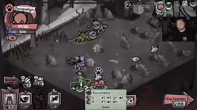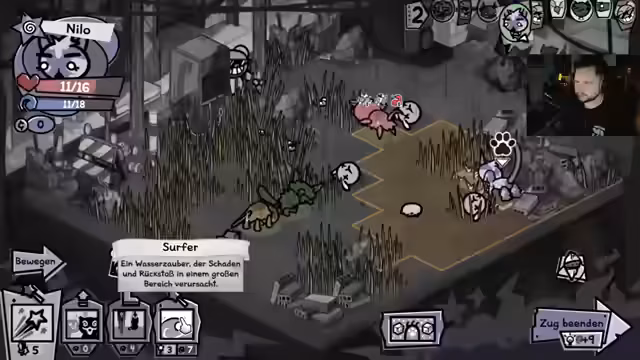 02:59:00Der Streamer startet in einen Kampf gegen eine fette Ratte, indem er seine Gruppe mit einem 'Speedball' doppt und damit seine Reichweite erhöht. Er beschließt, sich hinter einer Deckung zu verstecken, um den Gegner anzugreifen. Die Situation wird kompliziert, als der Gegner mit Magie ankommt, und der Streamer muss schnell entscheiden, wie er seine Katzen positionieren und welche Fähigkeiten er einsetzen soll, um den Schaden zu minimieren und den Gegner zu besiegen.