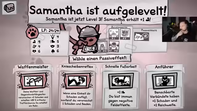 00:09:40Nach einem humorvollen Exkurs über den Nutzen von Wissenschaft beginnt das Tutorial von Mugenics. Es werden die Grundlagen des Kampfsystems erklärt: Jede Katze hat eine Bewegungs- und Angriffsaktion pro Zug. Passivfähigkeiten werden vorgestellt, die nach dem Besiegen eines Gegners einen zufälligen Stat-Boost gewähren. Mana-System und Zauberfähigkeit werden ebenso erläutert wie die Wichtigkeit der Zugreihenfolge und der Positionierung, um hinteren Angriffen mehr Schaden zuzufügen.