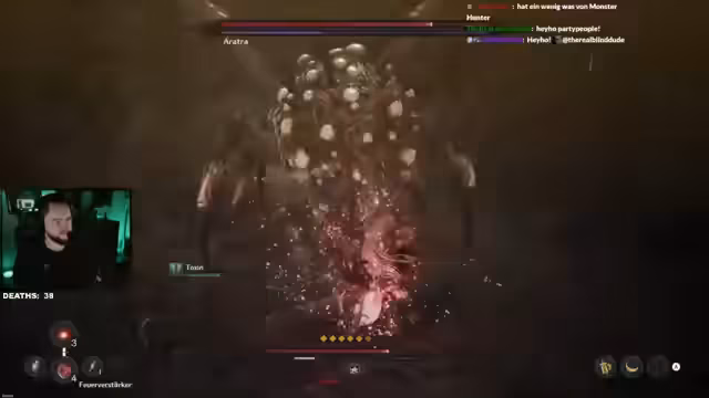 03:45:15Der Streamer stößt auf eine Ansammlung toter Körper und beginnt einen Bosskampf. Er stellt fest, dass es sich nicht um Untoten handelt und entscheidet, seine Agilität und seinen Angriffsschaden zu verbessern. Während des Kampfes testet er verschiedene Moves, darunter einen Sprungangriff über einen Angriff des Bosses. Er entdeckt das Konzept von brutalen Angriffen und deren Finisher-Animationen, die nur bei bestimmten Bedingungen ausgelöst werden können. Dieser Fund stellt für ihn einen Höhepunkt dar und motiviert ihn, zukünftige Bosskämpfe strategischer zu gestalten, um diese besonderen Animationen zu sehen.