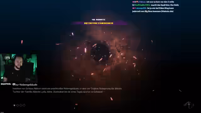 07:24:22Der Streamer startet einen Wettkampf mit seiner Community über den kommenden Bosskampf. Während die Zuschauer ihre Wetten platzieren, erkundet der Streamer eine neue Region des Spiels, die er deutlich schwerer findet und einen 'Difficulty Spike' feststellt. Nachdem er mehrere Gegner besiegt hat, erscheint der Bosskampf-Arenen-Eingang. Die Wette wird abgeschlossen, und der Streamer geht in den Kampf, dessen Mechaniken er aus einer vorherigen Demo bereits kannte.