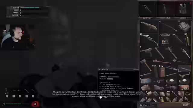 00:17:41Der Streamer hat Schwierigkeiten mit seinem überladenen Inventar und sucht seine Spitzhacke, die er offenbar unbewusst abgelegt hat. Er stellt fest, dass er über dem Gewichtslimit liegt und überlegt, wie er Gegenstände loswerden kann, um das Problem zu beheben. Er schlägt vor, weniger perfekte Paraden zu machen, damit Waffen schneller kaputtgehen und Platz im Inventar schaffen. Während des Kampfes gegen Spinnengener, die ihn an Quallen erinnern, entscheidet er sich, nicht anzugreifen, um keine unnötigen Gegenstände aufheben zu müssen. Er muss sich von einigen seiner Gegenstände trennen, darunter eine Small Pickaxe, um sein Gewicht zu reduzieren. Er nimmt jedoch Stimpaxe und Army-Rations mit, obwohl er nicht oft Hunger hat, überlegt aber, ob er mehr sprinten sollte, um Hunger zu bekommen und die Rationen zu nutzen.
