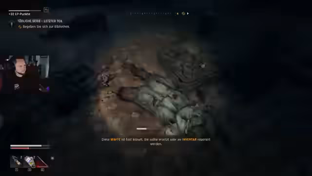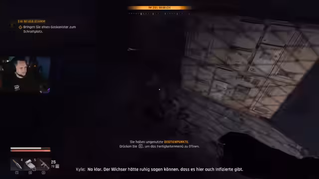 00:23:22Nach ausgiebigen Smalltalk wird das Spiel Dying Light: The Beast gestartet. Der Streamer befindet sich in einem komplexen Lager und beginnt mit der Erkundung. Das Ziel ist es, Fragezeichen auf dem Kompass abzuklappern und Ressourcen zu sammeln, um Waffen herstellen und verbessern zu können. Dabei stößt er auf erste Gegner und kämpft sich durch die Umgebung.