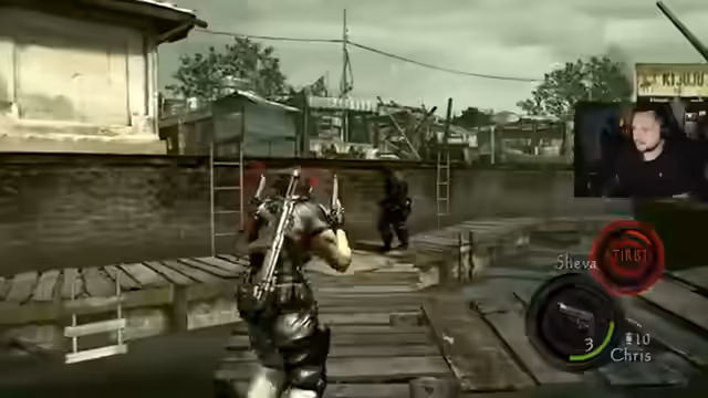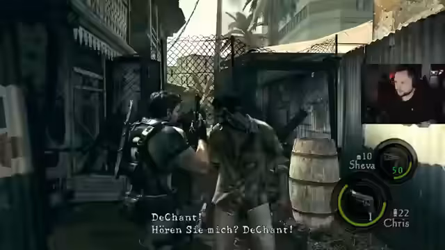 01:16:37Nachdem alle technischen Hürden genommen und die Einladungen zum Spiel verschickt wurden, beginnt der eigentliche Gameplay-Teil. Der Streamer spielt als Chris Redfield, @internetshawna emma als Sheva Alomar. Sie begeben sich in ein afrikanisches Dorf, das von einer neuen Form des Bioterrorismus heimgesucht wird. Die erste Begegnung mit Infizierten gestaltet sich chaotisch, wobei die ungewohnte Steuerung, insbesondere das gleichzeitige Rennen und Drehen der Kamera, für einige Verwirrung sorgt. Sie treffen auf den Waffenhändler und beginnen mit dem Tutorial, um die Grundlagen der Steuerung und des Kampfsystems zu erlernen.