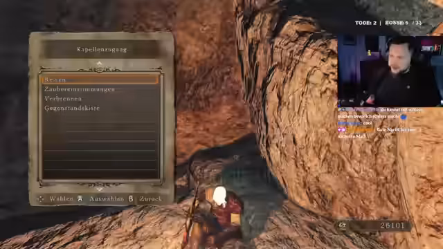 02:19:11Der Streamer steht vor der Entscheidung, wie er weitergeht. Die Chat-Community hat ihm eine Wette angeboten, dass er stirbt, wenn er den riskanten Weg einschlägt. Diskutiert wird, ob man den Boss Pur-suier im Spiel als echten Boss oder als Miniboss zählt. Er erklärt, dass man nicht farmen darf und daher jeden Gegner einmalig töten muss, was für einen No-Death-Run riskant ist.