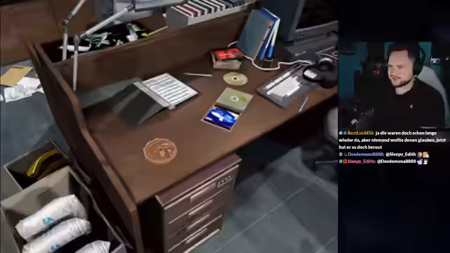 00:51:21Der Fokus liegt auf der Erkundung der Räumlichkeiten im ersten Stock. Der Streamer findet Schlüsselkarten und erforscht verschiedene Büros. Chris Redfields Tagebuch wird vorgelesen, das seine Ermittlungen gegen Umbrella und den G-Virus schildert und seine Sorge für seine Schwester Claire verrät. Gleichzeitig werden die Schreibtische von anderen Stars-Mitgliedern wie Jill und Barry gezeigt.