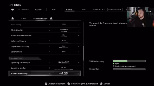 00:32:40Um die Performance-Probleme zu umgehen, entscheidet sich die Streamerin, auf das anspruchsvolle Path Tracing zu verzichten und stattdessen auf Ray Tracing zu setzen. Sie probiert verschiedene Upscaling-Methoden aus, darunter DLAA und DLSS, und stellt fest, dass manche Optionen wie Frame Generation ohne V-Sync funktionieren. Sie fühlt sich von den komplexen Einstellungen überfordert und muss häufig Kompromisse eingehen, um das spielbar zu machen.