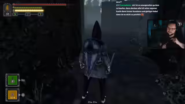 02:38:12Nachdem eine anfangs gewählte Waffe als zu langsam und unpraktisch empfunden wurde, entscheidet sich der Streamer für ein neues Schwert. Er ist von dessen Aussehen und dem Effekt, der Ausdauer verbessert und das Rollen und Sprinten ausdauerfrei macht, begeistert. Eine Enthusiasmus, der sich auch auf Mountain-Dew ausdehnt, das er oft in Geschäften kauft und dessen Ankauf er als peinlich, aber lecker empfindet.