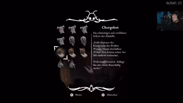 04:55:01Die Ewigkeit in Silksong wird durch die Kralle des Architekten aufrechterhalten, mit Elementen wie Scheibe, Rotor und einer gern vergebenen Seele. Es gibt Anspielungen auf den Weißen Wurm, der an Hollow Knight erinnert, wo Würmer aus dem Nichts kamen und der Pale King herrschte. Der Streamer spricht über Lieferquests und ob diese notwendig sind, um bestimmte Ziele zu erreichen, oder ob sie optional sind und später erledigt werden können. Es wird spekuliert, dass noch niemand genau weiß, ob diese Quests wichtig sind. Der Streamer entscheidet sich, eine als unwichtig eingestufte Aufgabe zu ignorieren und stattdessen zum Brocken zu gehen. Beim Erkunden wird eine alte Rune gefunden, die den Bauplan einer Weber-Waffe, den Seidenschuss, abbildet. Diese Waffe verwendet Schalenkanister und die Seide des Trägers bei ihren Schüssen. Der Streamer spricht über Aggressionen gegenüber Silksong, aber auch über den Spaß und die Emotionen, die das Spiel auslöst. Mysteriöse Questgegenstände wie die Sucherseele werden erwähnt, und es wird spekuliert, was das Materium und ein Zuhause in diesem Kontext bedeuten könnten. Der Streamer erinnert sich daran, etwas markiert zu haben und will dorthin zurückkehren.