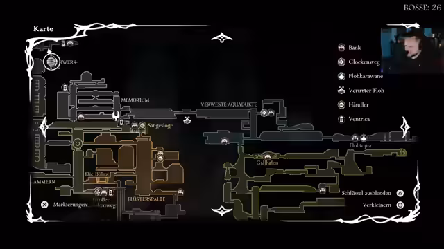 04:15:12Die Streamerin entdeckt einen Weg und holt einen Awun. Sie trifft einen NPC, der vor verwünschten Hülsen warnt. Es wird überlegt, wie man zu einem Floh im verwesenden Aquädukt kommt. Die Streamerin findet ein Item und rettet den Floh. Sie vermutet, dass ein kleiner Arena-Kampf bevorsteht. Es wird ein Weg gesucht und eine Salmenwalze entdeckt. Die Streamerin will überprüfen, ob sie ganz nach links fliegen kann, wo der Floh ist. Sie erinnert sich, dass sie schon einmal hier war und überlegt, ob sie ihre Melodie trällern muss. Die Streamerin hat den Weg oberhalb dieser Hallen geöffnet und den Weißen Ritter besiegt. Sie fragt sich, warum ein Charakter nicht in den Kampf kommt und was die Harfe bewirkt. Die Streamerin vermutet, dass es wie ein Teil 1 mit der Seuche ist. Sie will die Aufgaben erledigen, von denen sie weiß. Die Streamerin will zu einem Floh in Pilgerruh und vermutet, dass sie über die weiten Felder dorthin kommt. Sie entdeckt, dass es da unten weitergeht und erinnert sich, dass sie da gegen die Decke geflogen ist. Die Streamerin wird darauf hingewiesen, dass sie das klopfende Monster ist. Sie singt ein Lied und erhält Biestersplitter. Die Streamerin will die Flöhe besuchen und stellt fest, dass sie in Flotopia sind. Sie stellt fest, dass sie ein Achievement für alle Flöhe bekommen hat.